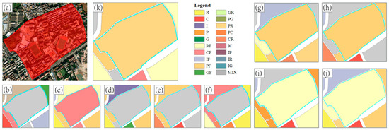 There is a large area of residential buildings and campus in the block (Figure 12), which should be recognized as a mixed-function area of public service and residence (PR). However, in the experiments using single-source features, POI (P), Image (I), Image (I2), and Building (B2) recognized the block as a mixed-function area without a dominant function and did not extract the characteristics of public service or residence, and the recognition effects were poor. Building (B) mistakenly recognized the block as a mixed-function area dominated by commercial use, which may have been due to the large differences between the floors and morphology of the residential buildings and campus buildings in this block. In the experiment using the combined data features, Building + Image (B + I) and POI + Building2 + Image2 (P + B2 + I2) recognized the block as a mixed-function area dominated by residential use, and failed to correctly extract the public service characteristics of the block. Both POI + Building (P + B) and POI + Image (P + I) recognized the block as a mixed-function area dominated by public service use, and failed to correctly extract the residence characteristics of the block. However, POI + Building + Image (P + B + I) recognized the block as a mixed-function area of public service and residential use, which was in line with the survey results.