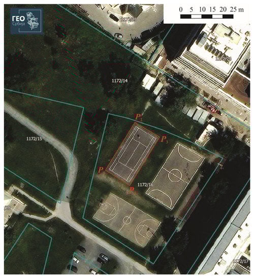 The purpose of the InterGNSS Network comparison is to determine and validate the competence of three GNSS permanent networks in the Republic of Serbia. For the realization of the InterGNSS Network comparison, a Test polygon was created with four points: (Figure 2, downloaded from the GEOSRBIJA portal [28]) in the city of Belgrade. The points were stabilized with geodesic pins in the asphalt of the Tennis court (Test polygon), assuring their stability.
