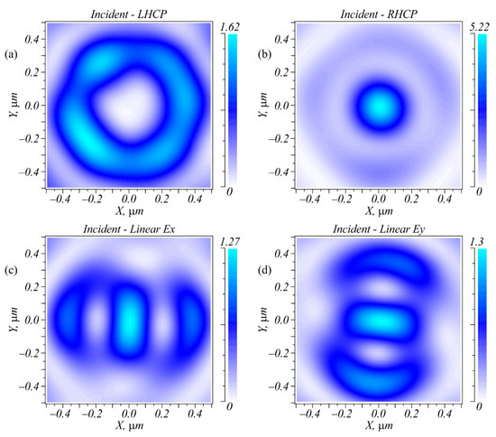 Intensity distributions in the metalens focus (Figure 1) for four different polarizations of the incident field: LHCP (a); RHCP (b); linear Ex (c); linear Ey (d).