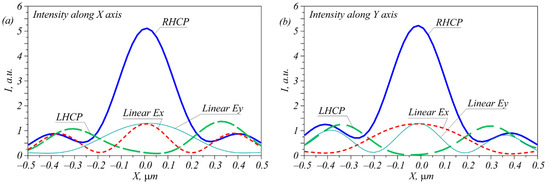 The simulation was carried out using the difference solution of the Maxwell equations via the finite difference time domain method (FDTD method) implemented in the Fullwave program (Rsoft). The simulation grid along all three coordinates in space was equal to λ/30. Figure 2 depicts the intensity distributions of laser beams with four polarization types; i.e., left circular (LHCP), right circular (RHCP), and linear polarization with the electric strength vector being directed along the X and Y axes after passing through the metalens (Figure 1). Figure 3 shows the intensity cross-sections along the X and Y axes.