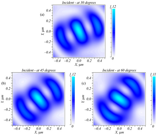Intensity distribution at the focal plane for the incident linear polarization rotated at angle φ: 30° (a); 45° (b); 60° (c).