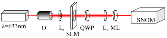 Experimental setup. Laser—Cobolt 06 MLD (λ = 633 nm, 80 mW); O1—20× objective lens; SLM—spatial light modulator (Holoeye LC 2012, 1024 × 768 px); L1, L2—lenses (f1 = 150 mm and f2 = 10 mm), QWP—quarter-wave plate; SNOM—scanning near-field optical microscope (Ntegra Spectra).