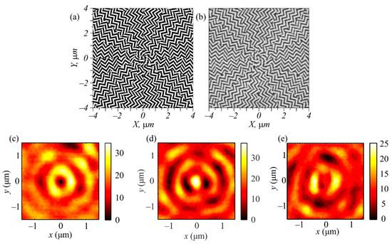 Binary photo template of metalens (14) (a); central part of the metalens fabricated in an amorphous silicon film (b); intensity distribution in the focus of the metalens when it was illuminated by an optical vortex with a topological charge of +1 and with different polarizations: left circular (c), right circular (d), and linear (along the horizontal axis) (e).