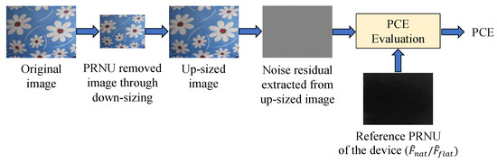 The PRNU fingerprint is embedded in the high-frequency bands of images [10]. Hence, removal of the PRNU fingerprint can be achieved by eliminating the high-frequency components of the image. There are various filtering operations for removing high-frequency components of images. Since we use ResNet as the fingerprint extractor (see Section 3.3), which require patches of 224 × 224 pixels as input, our first method for PRNU removal is downsampling (a form of low-pass filtering), which serves not only to remove the PRNU but also conforms to the ResNet architectural requirement. We apply bilinear filtering (low-pass filtering) to downsample each image to 224 × 224 pixels with three color channels. To ensure effective PRNU removal, we evaluate the similarity between the noise residual extracted from the PRNU-free image and the reference PRNU of its source camera using the widely adopted Peak-to-Correlation Energy (PCE) [11], as depicted in Figure 1. The experiments in [11] suggested a PCE detection threshold of 50 to determine whether two images are from the same source device. The greater the PCE value is, the higher the likelihood that the two images are of the same origin. Further, counter-forensic attacks used to impede PRNU often fix the PCE detection threshold at 50 to ensure effective PRNU removal, thereby unlinking the images from their source cameras [25,32]. Thus, in the proposed work, we also use 50 as the threshold to determine whether the downsampled images have become PRNU-free.