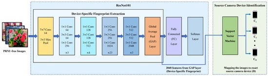 Feature/fingerprint extraction plays a major role in the success of source camera identification. It necessitates that extracted features exhibit discriminative characteristics among different cameras while retaining a high degree of homogeneity within the same class. The discriminative power of the features/fingerprints can be boosted by increasing the number of stacked layers. ResNet has many variants with different numbers of layers such as ResNet18, ResNet34, ResNet50, ResNet101, etc. With an increase in the number of layers, ResNet can integrate multiscale features from multiple layers to enhance feature discriminative power. In this work, we employ the ResNet model with 101 layers (ResNet101) as the backbone of our device-fingerprint extractor. The proposed ResNet-based device-specific fingerprint extractor is shown on the left side of Figure 2.