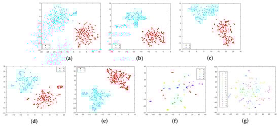 Results obtained with t-SNE on different datasets demonstrating the separation between different devices belonging to the same model: (a) two iPhone 5c devices, (b) two iPhone 4s devices, (c) two Fujifilm X-A10 devices, (d) two Redmi Note 3 devices, (e) two Asus Zenfone Max Pro M1 devices, (f) five Xioami 4A devices, and (g) 16 devices of 6 different models from the Daxing dataset.