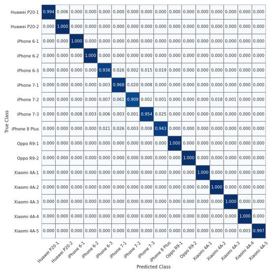 To allow for a more detailed comparison, we show the normalized confusion matrices on the 16 devices of the Daxing dataset (Experiment 7) in Figure 4, Figure 5 and Figure 6. We can see that the source identification performance only drops slightly for a few iPhone devices, i.e., iPhone 7 and iPhone 8 Plus. These results appear to indicate that involving more devices in the training is beneficial for learning discriminative device-specific fingerprints. However, as we involve more devices in the training, we should not overlook the potential chance of learning model-specific rather than device-specific fingerprints, because the number of camera models is usually larger than the average number of devices of the same model in a dataset. Thus, further studies are required to investigate the appropriate way of constructing datasets for learning discriminative device-level fingerprints. Another interesting observation from Table 3 is that random sampling from the downsampled images slightly outperforms random sampling from the original images. We contend that most high-frequency components removed by downsampling can be considered interference for device-specific fingerprint extraction. Therefore, similar to the common practice of suppressing the influence of scene details on PRNU to improve source-camera identification [23], random sampling from the downsampled images rules out the effect of interferential high-frequency components in the images on the new device-specific fingerprint and thus improves device identification performance.