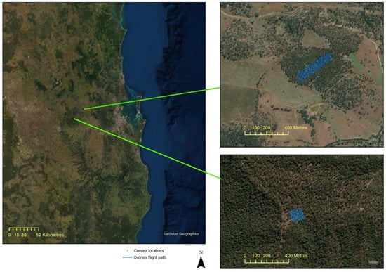 Location of private native forest sites selected for the study and the drone flight path used to collect images. Sites were located near Ravensbourne (site 1) and Esk (site 2). Background true colour images are from different remote-sensing satellites available in ESRI base maps.