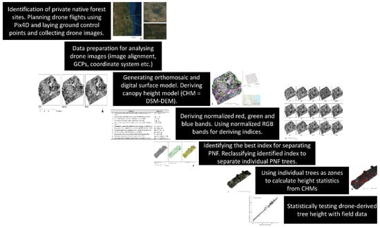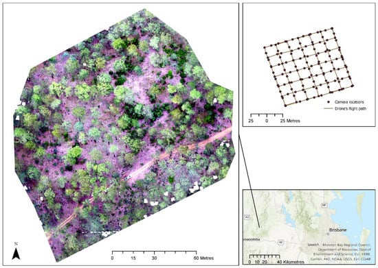 This research used two privately owned sites where the native forest is managed for timber and grazing production. The drone data were collected for different sites in the period from August to November 2020 and the field–forest inventory data were collected at the same time. The research utilised point clouds derived from drone flights over the selected sites. The following software packages were used for extracting information: (1) ArcGIS Pro/ArcGIS; (2) R-statistics; (3) ENVI; and (4) Metashape.