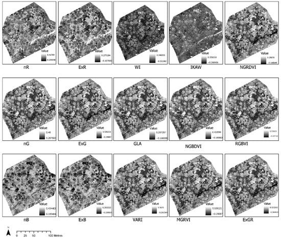 The visual analysis of indices clearly indicated variation in information content that could be further utilised for extracting multiple features such as vegetation types, bare soil, or grass area. For this study, we selected NGBVI to separate vegetation. Figure 5 shows the normalisation of the red, green, and blue spectra and the calculations of various indices from normalised bands.