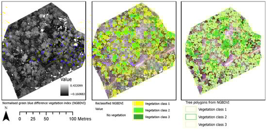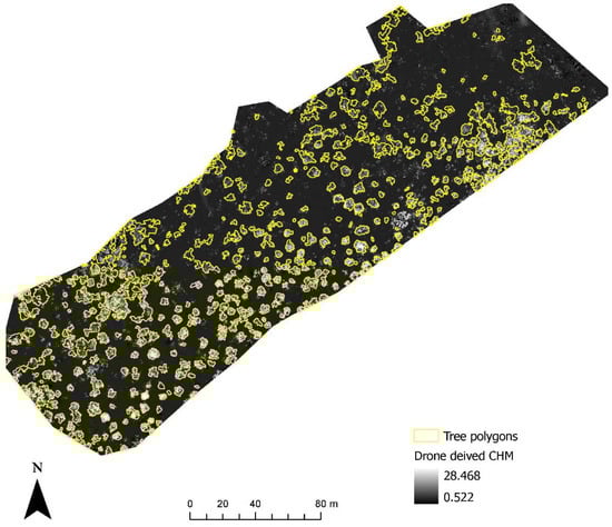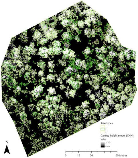 Figure 6 shows the identification of an index and its reclassification to extract trees and their differentiation into three classes. For the first site, the reclassification of NGBVI clearly differentiated trees from other features. Variation between three vegetation types based on NGBVI was noted, but this study focuses only on separating trees and estimating their height. The separation of trees enabled the extraction of tree crown areas, which were then converted to simplified polygons with a separate identification. Figure 7 shows the generation of the canopy height model to allow for the extraction of height information for different trees. The polygons created for each tree were further used to perform a zonal operation on CHM to acquire detailed statistics of the height of each tree. Some further results for a second site are shown in Figure 8, Figure 9 and Figure 10. For this site, tree height statistics and crown area were derived, and tree heights were compared with those assessed in the field (Figure 11). There was a strong relationship between field-measured heights and those derived from the CHM (p < 0.0001, Figure 12).