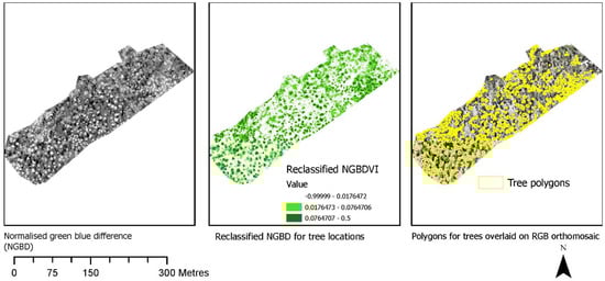 We used ArcGIS Pro 2.8 to calculate all the indices. For this study, we used normalised green-red difference index (NGBDI) to separate vegetation from other features. On visual inspection of all the indices, the normalised green-red difference index (NGBDI) was found best for separating individual trees. Considering this, we used NGBDI to separate trees from other features. Once vegetation was separated, a separate cleaned polygon was generated for vegetation.