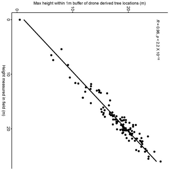 To test the accuracy of the tree heights estimated from the drone images, we created a buffer of 1 m around each field data collection location and picked the maximum value from the canopy height model (CHM) within this zone. To test the statistical relationship between drone-derived and the height measured in field, we used a Pearson’s correlation test using the ggpubr library available with R statistics software.