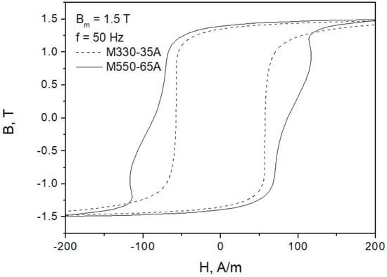 Figure 1 presents some of the measured hysteresis loops for the considered grades at T and mains frequency (50 Hz in Poland). The measurements were carried out using a Single Sheet Tester device in accordance with the requirements of the IEC 60404-3 standard. The system MAG-RJJ-2.0 [12] makes it possible to determine the properties of soft magnetic materials with the following fundamental parameters: