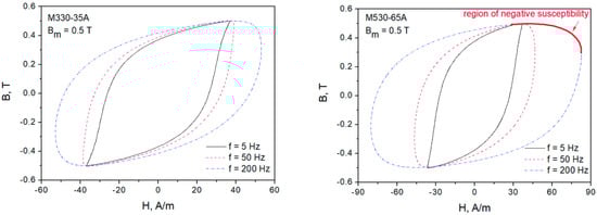Measured hysteresis loops for two NO steel grades at T. At the increased excitation frequency, the regions with negative dynamic susceptibility are clearly visible.