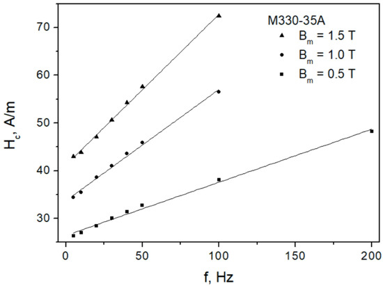Figure 4 depicts the measured dependencies for the M330-35A steel grade, whereas Figure 5 depicts them for the M530-65A steel grade. The results of the straight-line fits are also shown. Two conclusions may be immediately drawn from the analysis of the figures: