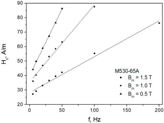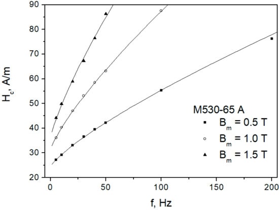It can, however, be seen that a fractional power law in the form might be more appropriate, as is evident from an inspection of Figure 6, which refers to the thicker (more “nonlinear”)-grade M530-65A. The value of exponent was fixed at . Moreover, the dependence was assessed. It may be estimated to be approximately Analogously, the dependence of quasi-static coercive field strength may be envisaged as a linear relationship with respect to induction It should, however, be remarked that the relationships given above were derived from a limited number of data points, and thus they should be treated in a rather qualitative way.