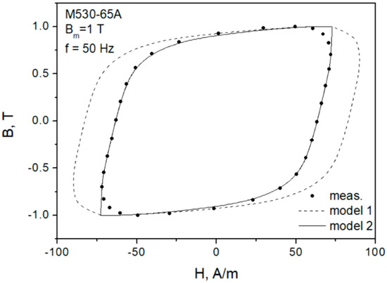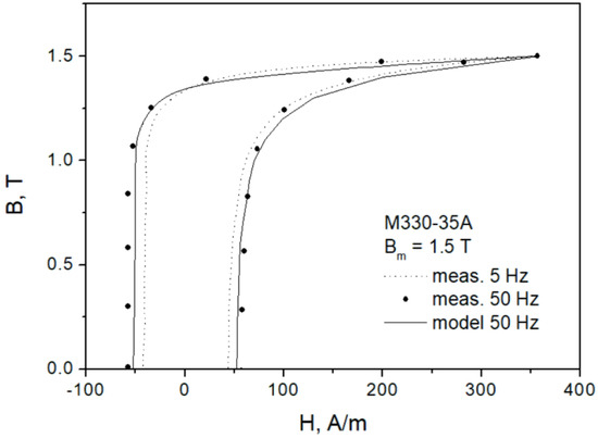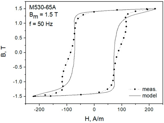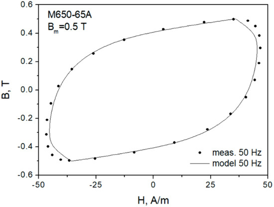 Figure 7 depicts the modeling results for the major loop of the M530-65A grade at f = 50 Hz. It can be seen that the “gooseneck” effect was not properly reproduced, the modeled loop branches are monotonous. However, the overall modeling result may be considered satisfactory in the first approximation. The absolute difference between the modeled and the measured loop areas (representing energy loss) did not exceed 6.1%.