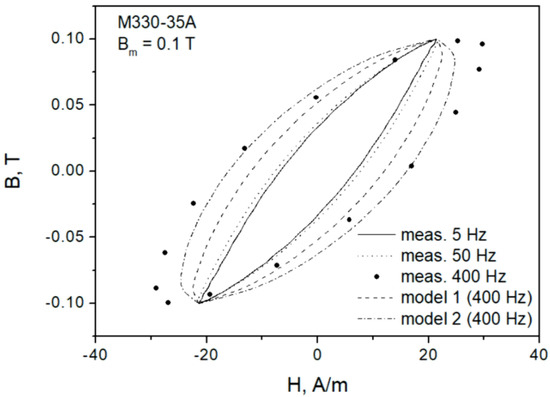 Figure 11 depicts several hysteresis loops for a low excitation amplitude. In Figure 9, the measured curves for 5 Hz and 50 Hz may be considered to be overlapping in practice; in any case, modeling was performed for the latter frequency (not shown), and the value of was determined. The same value was subsequently used in modeling assuming f = 400 Hz (model 1). There were considerable discrepancies between the modeled and the measured loops; therefore, the parameter was freed, and a new value was determined (model 2). The modeled loop better matched the measured one. A general conclusion may be drawn that should be determined individually in each considered case, since it is a function of both amplitude and induction rate; however, the determination of some useful functional dependencies is postponed to future research.