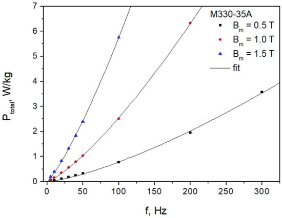 To indirectly prove the validity of the approach presented in this paper, let us examine the dependence of total losses versus frequency using true measurement data (given explicitly for the M330-35A grade in Table 1 in Ref. [43]). The measurements shown in Figure 12 (points) were carried out for three values of induction commonly of interest to practitioners, i.e., 0.5 T, 1.0 T and 1.5 T.