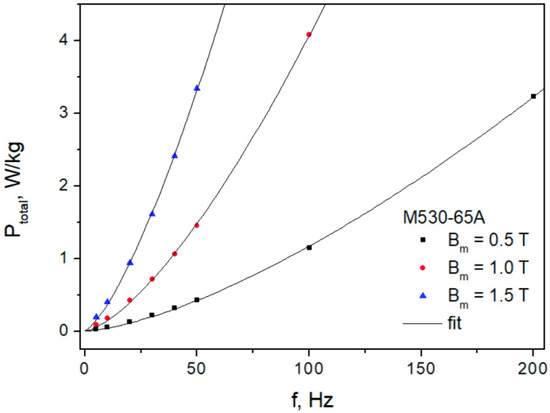 A similar analysis was performed for the M530-65A grade. Figure 13 depicts the measurement points and the fit with the value of exponent in dynamic loss term fixed at 1.463. The averaged absolute deviation between the measured and the modeled data points was equal to 9.5%. The corresponding averaged value of for the three-term formula was equal to 14.7%.