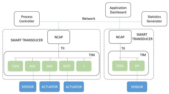 In Figure 2, a simplified architecture based on IEEE 1451 is proposed. It presents a simple control loop containing two Smart Transducer Modules and a logical process controller (e.g., PLC). The module on the left presents multiple connections to sensors and actuators, making it behave like a custom I/O card. Such a solution could be implemented to install transducers in isolated parts of a machine. Having the signal conditioning and acquisition closer to the source of the signal reduces signal interference caused by electromagnetic noise present on a plant floor. The transport of digital information is also more robust than analog data. Furthermore, by only using one cable to connect the NCAP to the network, the quantity of cabling is reduced, an ecological and economically desired progress.
