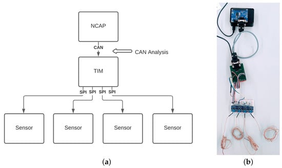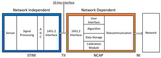 Taking IEEE 1451 to a completely different and unexpected application, Pinto et al. created a Vehicular Sensing Network (VSN) [23] based on e-bicycles with the intent to monitor the mobility platform, i.e., the e-bicycles’ battery usage and location, and to measure the air quality throughout a small city. To do this, Pinto et al. defined an infrastructure in which TIMs are installed in bicycles coupled with ozone, humidity, temperature, and energy metering sensors. NCAPs are implemented into the user’s mobile phone which is responsible for monitoring three data transducing systems: the bicycle’s TIM, the phone’s GPS sensor and a virtual TIM implemented as an Android app featuring a user interface. There are also NCAPs installed in the e-bike photovoltaic charging stations. Communication between NCAPs and TIMs uses Bluetooth (IEEE 1451.5 [9]). The TIM, NCAP, and TEDS implementation is explained by Pinto et al. [23], and the authors conclude on the versatility of the solution implemented thanks to the IEEE 1451 standard being used. This versatility is again evidenced in the future work proposed already foreseeing the integration of new sensors into the network (e.g., fall detection sensor). In a more practical approach, Fan et al. implemented a smart transducer [24] based on IEEE 1451.2 [6]. The STIM implementation is made on an FPGA and the NCAP is implemented around an STM32 microcontroller. A detailed report on the work developed is presented, explaining the TII implementation (10-pin SPI interface as per standard). Tests on the network interface are also made, testing CAN, RS-485, SPI and Universal Asynchronous Receiver-Transmitter (UART). This work is concluded by presenting successful reports on the implementation of sensor communication. Whilst this paper introduces no new scientific knowledge, it presents a hands-on approach in the part of the work this is focused on, proving the feasibility of the work. The simple architecture used by Fan et al. is presented in Figure 3.