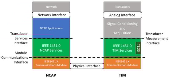 The TII defines the interface between the NCAP and the TIM. This interface is responsible for conveying the data collected by the TIM to be processed by the NCAP and the actions received by the NCAP to be carried out by the TIM. The IEEE 1451 standard provides various possibilities for the TII implementation, allowing for vast use cases of these interfaces. In [13], TII is presented as: an SPI interface (IEEE 1451.2); a multi-drop communication transducer network (IEEE 1451.3); a wireless interface (e.g., 802.11-Wifi, 802.15.1-Bluetooth, 802.15.4 (Zigbee), 6LowPAN) (IEEE 1451.5); a high-speed CANopen network (P1451.6); and an RFID system (IEEE 1451.7).