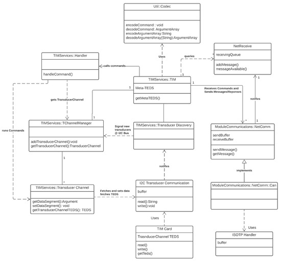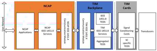 With such objectives in mind, the architecture presented in Figure 5 was devised. Following this architecture, the transducing system comprises three main components: the NCAP, the TIM backplane, and the TIM signal acquisition and conditioning cards. As this architecture implements the standard, many of the blocks are similar to the ones found in the reference model. However, this architecture presents some differences, which will be evidenced in this section.