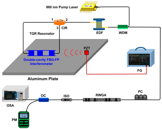 The experimental scheme of the narrow linewidth half-open-cavity RFL with a TGR resonator for dynamic strain detection is shown in Figure 1. A 980 nm source pumped the 4 m erbium-doped fiber through a 980/1550 nm wavelength division multiplexer (WDM), which provided sufficient linear gain. The RWGA provided high random feedback efficiency, where 30 weak FBGs were etched into an SMF through the phase mask method and ultraviolet exposure, which ensured the realization of multiple stabilized narrow-linewidth RFLs with a highly consistent performance. The reflectivity, central wavelength, and length of each weak grating were controlled to about 4%, 1537.5 nm, and 3 mm. The intervals between neighboring weak gratings were randomly selected in the range of 3–8 cm, which were the same as the following simulated parameter settings. The effective length of the RWGA feedback was about 167 cm. The proposed TGR resonator consisted of the specially designed double-cavity FBG-FP interferometer, a section of SMF, and a circulator (CIR). The CIR can maintain light unidirectional transmission and further suppress the spatial hole-burning effect. The designed double-cavity FBG-FP interferometer, which has one ultra-narrow peak, was fabricated by the same writing setup as RWGA. For effectively selecting lasing spectra, the wavelength of a single transmission window of our proposed TGR resonator should be within the 3 dB bandwidth of the reflection spectrum of RWGA. This high-reflectivity TGR resonator and RWGA feedback form a half-open-cavity structure, which can greatly improve the lasing efficiency of the RFL combined with the linear high gain of EDF. Additionally, the designed double-cavity FBG-FP interferometer was introduced to lock the laser and acted as a strain-sensing element. As shown in Figure 1, the double-cavity FBG-FP interferometer was bonded to the surface of aluminum plate. The size of the aluminum plate was 500 mm × 500 mm × 4 mm. A piezoactuator (PZT) actuator was bonded 5 cm away from the double-cavity FBG-FP interferometer. The sinusoidal signal with a 10 V voltage was applied from the function generator (FG) to the PZT actuator. The polarization controller (PC) adjusted the intensity and polarization states of light and minimized interference-related background noise. The isolator (ISO) mainly reduced the external Fresnel reflection and ensured that effective random feedback was only introduced by RWGA. The output spectrum and its peak-power were monitored by an optical spectrum analyzer (APEX, AP2061A, respectively). The total output power was measured by a power meter (OLP-6, Acterna).