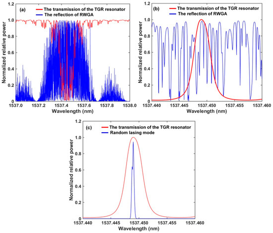 (a) The calculated transmission spectrum of TGR resonator and reflection spectra of RWGA; (b) enlargement of Figure 3a; (c) narrow lasing with multiple time gain.