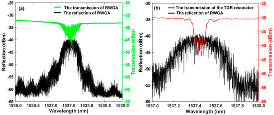 (a) Reflection and transmission spectrum of RWGA; (b) reflection and transmission spectrum of the TGR resonator and RWGA.