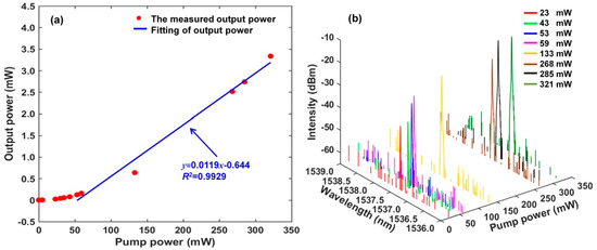 (a) Output power versus pump power; (b) output spectrum changes with pump power.