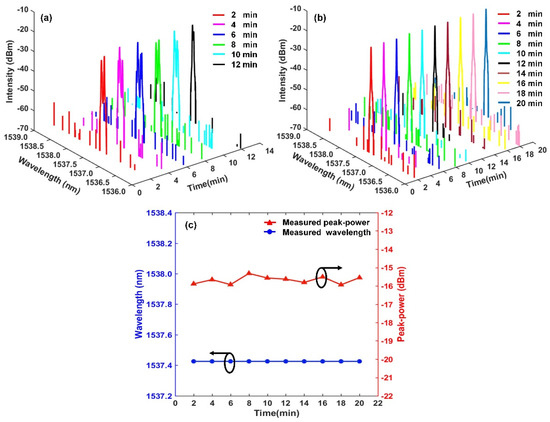 When the pump power is fixed at 200 mW, the time−varying of output spectra of our proposed RFL without and with the TGR resonator are shown in Figure 6a,b. The different colors spectral lines are shown in Figure 6a, with time, there is no stable single−wavelength lasing without a TGR resonator. Under the flat linear gain of EDF, the gain competition of random resonant−cavity modes is serious due to their approximate quality factor. Thus, a few of the random resonant−cavity modes are simultaneously amplified and oscillated, which lead to random splitting lasing spectra. Multitudinous random sub−cavity modes are induced into the RFL as the pump power increases. Those random resonant modes with low quality factors are also activated and emitted, which easily results in multi−spike lasing of the output spectrum and spectral broadening. Besides, nonlinear effects inside RWGA, broadband linear gain of EDF, and energy fluctuations in the random resonant cavity also contribute to the unstable output spectrum with time. As shown in Figure 6b, when the designed TGR resonator is embedded into the RFL, within 20 min (min), a long−term stable single−wavelength lasing spectrum without obvious fluctuations is achieved. The OSNR of the stable lasing spectrum at the central wavelength of 1537.426 nm is up to about 43 dB. The proposed TGR resonator just accommodates dominated random sub−cavity modes inside RWGA and suppresses undesired residual modes hopping. The dominant position of the random lasing mode is enhanced, resulting in a stable single−wavelength output. Figure 6c shows the variation of the central wavelength and output peak−power with time. The maximum fluctuation of the lasing wavelength is less than 1 pm. The maximum fluctuation of the output peak−power is about 0.62 dB. The output wavelength and peak−power exhibit good long-term stability. The TGR resonator inside the proposed RFL can effectively reduce the amount of resonant modes and adjust the transmission loss of the random resonant cavity. The lasing wavelength is locked in the narrow transmission window of the TGR resonator, ensuring a relatively stable output. Besides, the higher stability of the pump source can contribute to the time−domain stability of the output spectrum. The experimental results clearly indicate that the proposed TGR resonator can bring the RFL from an unstable multi−wavelength to a stable single-wavelength operation.