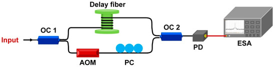 The linewidth measurement of the RFL based on delayed self−heterodyne (DSH) technique is shown in Figure 7. The OC 1 has a ratio of 95/5 and divides the output light of the RFL into two parts, with the larger part going into the delay fiber and the smaller part entering an acousto−optic modulator (AOM) and a PC, which downshifts the optical frequency of the laser light by 200 MHz. A photo detector (PD) is connected to the recombination of two output light beams to detect the beat spectrum that centered at 200 MHz with an electrical spectrum analyzer (ESA). The length of the delay fiber is controlled with 75 km to ensure that two output light beams are uncorrelated with each other. Then, an accurate Lorentzian line shape measurement of RFL is recombined and obtained.