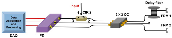 p and q are arbitrary positive integers. R1, R2, and R3 are mainly determined by length L1, L2, and L3 and index modulation depth ∆n1, ∆n2, and ∆n3 of each FBG [35]. The effective refractive index of SMF is neff = 1.46. The same central wavelength of each FBG is λB = 1537.43 nm.