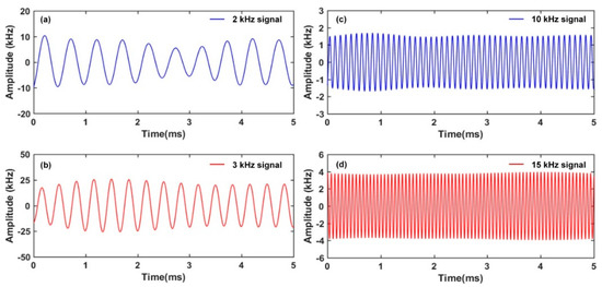 The response of the RFL sensor to dynamic strain signal is further investigated. The designed double−cavity FBG-FP interferometer is inserted into the proposed TGR resonator for locking the laser and acting as a strain sensing element. As shown in Figure 1, the double−cavity FBG-FP interferometer is bonded to the surface of aluminum plate. The size of aluminum plate is 500 mm × 500 mm × 5 mm. The PZT actuator is bonded with 6 cm away from the double−cavity FBG-FP interferometer. The sinusoidal signal with a 10 V voltage is applied from the function generator (FG) to the PZT actuator. A dynamic strain signal with up to kilohertz frequency can be generated and then propagate along the aluminum plate. Such dynamic strain signal disturbs the index modulation planes of the double−cavity FBG-FP interferometer, which introduces a frequency shift of reflection spectrum. As a consequence, the round−trip random cavity loss caused by the dynamic strain signal will impose an intensity modulation of the random fiber laser. According to Figure 1, the FG drives PZT to generate a sinusoidal signal with a 10 V voltage to simulate the strain source. The low−frequency interference inside the original signal is eliminated through a filter with 1 kHz threshold. As shown in Figure 11a–d, laser modulation that is induced by different strain signals of 2 kHz, 3 kHz, 10 kHz, and 15 kHz is recorded. The periodic sinusoidal strain signals present a good waveform.