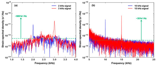 Figure 12 shows the strain power spectral density of the response of our proposed RFL sensor. In accordance with 1.21 pm/με sensitivity [43], as shown in Figure 12a, the dominating signal peaks are found at the frequency of 2 kHz and 3 kHz, respectively, and the resolution of the dynamic strain is about 500 fε/√Hz. As shown in Figure 12b, the dominating signal peaks are found at the frequency of 10 kHz and 15 kHz, respectively, and the resolution of the dynamic strain is about 35 fε/√Hz. The measured resolution of 35 fε/√Hz corresponds to the estimation of the dynamic strain resolution (53 fε/Hz) calculated by the 3 dB linewidth. This clearly indicates that the proposed RFL strain sensor provided a good response with the identical frequency to the generated dynamic−strain signal. By adjusting the PZT driving frequency of the sinusoidal signal from the function generator, kHz continuous dynamic strain signal can be activated and then presented. This experimental result suggests that our proposed RFL strain sensor based on a double−cavity FBG-FP interferometer is capable of dynamic strain detection. We note that the relatively lower dynamic strain resolution at frequencies of 2 kHz and 3 kHz mainly resulted from the higher laser intensity fluctuation background at intrinsic frequencies close to about 2.5 kHz. Furthermore, the hopping peak with a low amplitude was caused by the intrinsic relaxation oscillation of the EDF−based RFL. Thanks to the narrower linewidth and lower frequency noise, our proposed RFL strain sensor exhibits about one−order of magnitude enhancement of the dynamic−strain resolution compared to the π−FBG−based random fiber laser strain sensor with a half−open−cavity structure [30].