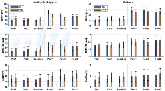 HRV data for healthy participants (left column) and patients (right column). The baseline shows the mean values of Pre1 and Pre2, which were obtained prior to the interventions. Post1, Post2, and Post3 were obtained 0–5, 12.5–17.5, and 25–30 min after the interventions, respectively. Data are displayed as the mean ± standard error across participants. DB: Deep breathing. tVNS: Transcutaneous auricular vagus nerve stimulation.