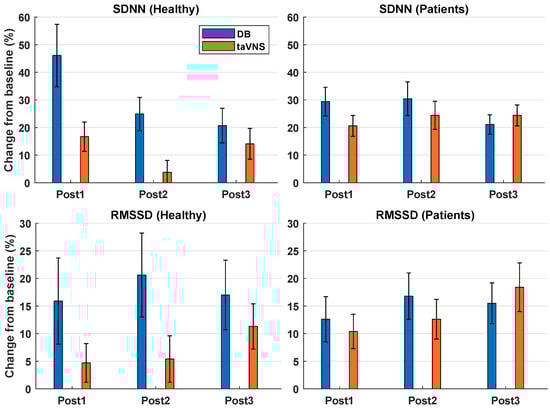 Percentage change from baseline to post-measurements for healthy participants and patients performing deep breathing (DB) or transcutaneous auricular vagus nerve stimulation (taVNS). Data are displayed as the mean ± standard error across the participants.
