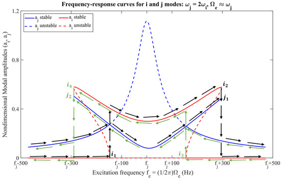 Recent studies [5,6,7,8,9] have revealed that for an oscillatory system, such as an MVG, if two or more of its linear resonant frequencies are commensurate, those corresponding modes could be strongly coupled depending on the order of nonlinearities in the system. Notably, for a multi-degree of freedom system with quadratic nonlinearities, a linear natural frequencies’ commensurability of for any of the system’s two modes and , could cause a special kind of resonance, known as a 2:1 internal resonance or 2:1 AR [10] between those two modes. For such a nonlinearly coupled system, when its higher frequency mode, mode , is externally excited via a harmonic force, such as , at its primary resonance, , and the forcing amplitude is greater than some threshold amplitude then due to quadratic coupled nonlinearities, mode gets internally or auto-parametrically excited via 2:1 AR, as shown in Figure 1. The black and green arrows in the figure represent the direction of the frequency sweep. The frequency bandwidth of the mode , due to 2:1 AR, is both considerably wider and flatter compared to the conventional linear resonance response. Figure 1 also demonstrates the nonlinear jump phenomenon and readers are encouraged to refer to the references [5,6] for detailed behavior of 2:1 AR.