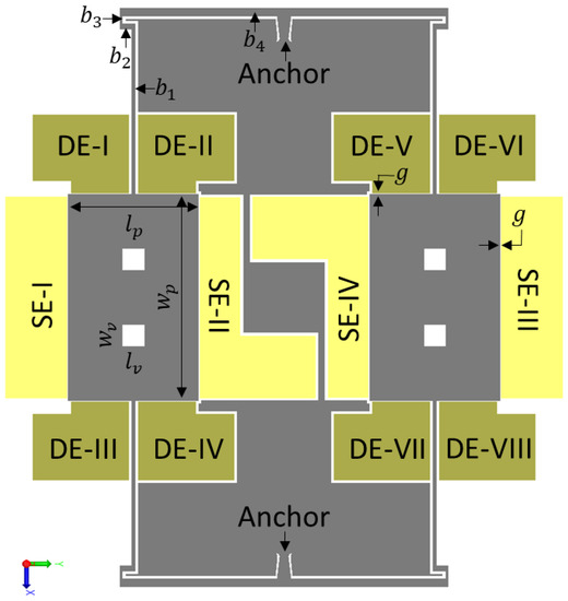 The dimensions annotated in Figure 2 are listed in Table 2. In the table, represents the surface area, , of beam . The square vents on either proof mass are in size.