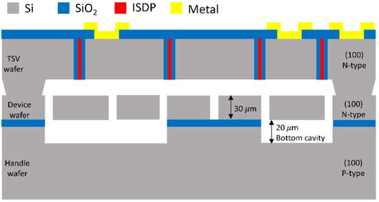 The MIDIS process In Figure 4 is a wafer-scale vacuum encapsulation technology with an inner pressure of or [52]. The device layer of RARS, including the resonator and its surrounding electrodes, is on a thick N-type doped silicon (100) wafer, referred to as the device wafer. A P-type doped silicon (100) wafer, referred to as the handle wafer, acts as the substrate and creates the device wafer’s bottom cavity. The third wafer is N-type doped silicon (100) wafer, known as TSV (through silicon via) wafer, which creates the top cavity and TSV for the device layer. The vacuum is created by fusion bonding the TSV wafer and the handle wafer on either side of the device wafer. The TSVs in Figure 4 include liners as insulators and in-situ doped polysilicon (ISDP) as conductors.