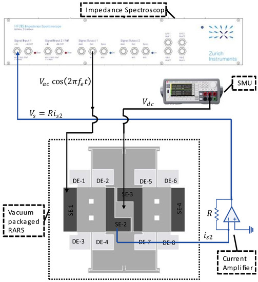 We now characterize the RARS for its 2:1 AR using the experimental setup shown in Figure 10. We apply the DC bias voltage to the device at the anchor via an SMU. As explained earlier, the AC voltage is applied using the frequency doubler to the drive electrode pairs of DE-1 & DE-2 and DE-7 & DE-8. Notice that these pairs consist of two shorted electrodes to maximize the electrostatic force to the proof mass and to optimally utilize the number of available electrical pads for wire bonding on the chip. The sense mode motions of the proof masses are differentially sensed using the sense electrodes SE-1 and SE-3. The notch filter attenuated the amplitude of parasitic feedthrough from the sense signal before feeding it to HF2LI.