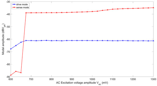 Next, we set the input parameters to , , and while varying , to obtain the force response curves shown in the semi-log plot of Figure 11. At , 2:1 AR occurs, and the sense mode response jumps up from the noise floor. For , the drive mode amplitude linearly increases, and after 2:1 AR, it saturates. For , the sense mode amplitude steadily increases on a log scale, which indicates considerable increment on a linear scale.