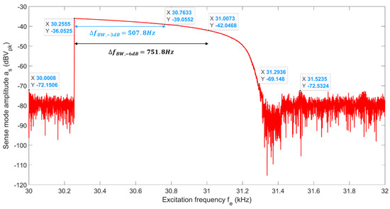 To test the sensitivity of the scale factor to variations in operating frequency, , we choose three distinct excitation frequencies. We obtain the scale factors of RARS at its (i) peak resonant frequency,, (ii) the half resonance power (i.e., 29.3% or −3 dB of amplitude drop from its peak) frequency, i.e., and (iii) the quarter resonance power (i.e., 50% or −6 dB of amplitude drop from its peak) frequency, of the sense mode’s 2:1 AR response, as shown in Figure 16. The frequency shifts at the half and quarter resonance powers are 1.7% and 2.5% of the frequency at its peak resonance power. Notice that the frequency span on the horizontal axis of Figure 16 is .