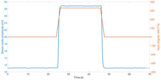 Figure 15 shows the pictorial description of the experimental setup demonstrated in Figure 14. The RARS is first driven to a stable 2:1 AR, and then a constant angular rate , a step input, for about 30 s is applied to the rate table via the control panel of the Aero 812 table controller. The filtered sense signal then carries the angular rate information at and is measured by HF2LI via the demodulator 1. For each step input, the sensor’s response is recorded via the spectroscope tab of HF2LI. Further, to precisely record the sensor’s output due to angular rate signal at , we utilize the inbuilt low pass RC filter of HF2LI at a bandwidth of 1 Hz. This allows us to reduce the noise in signal due to the applied angular rate at the sense mode frequency .