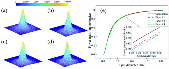 Simulated and experimental results: (a) simulated spot; (b) experimental spot of fiber #1; (c) experimental spot of fiber #2; (d) experimental spot of fiber #3; (e) PIB curves of four spots.