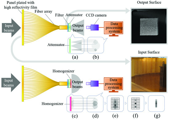 The working principle of the system is shown in Figure 3. First, laser beam incidents occur on the sampling target plate, most of the light is reflected out of the system to reduce the total amount of converted heat, and the fiber ferrules are connected to the array holes on the plate. Then, the cross-section spot is sampled as an array of many small spots and transmitted to the output end of the fiber array; at this time, the total diameter of the origin spot decreases as the array becomes more compact. After filtering and attenuation, in order to prevent the shooting distortion shown in Section 2.1, the array spots are homogenized. The homogenizer is made of a kind of bulk-scattering material to achieve sufficient homogenization, but to avoid the spot crosstalk being too much, its thickness is set at 0.1 mm. As shown in Figure 3d, the output beams with different divergence angles are converted into diffuse beams after homogenization. Meanwhile, the array spots are diffused and overlapped with the surrounding spots. For each unit spot, although the total intensity is unknown, they all follow the known uniform Gaussian model, as performed in Section 2.2. Therefore, the array spots with crosstalk can be divided by computational processing to restore the real output of the fiber array. Then, coupled with interpolation expansion processing, the original cross-section spot can be restored, and the power density distribution is finally made available through this and the power calibration coefficient.