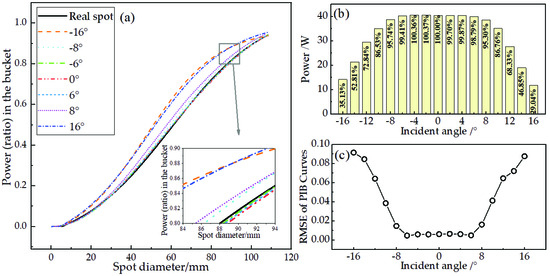 (a) PIB curves of the measured spots at different incident angles and the actual spot; (b) absolute value of the measured total power and their ratios relative to the true power when the incident angle changes between −16° and 16°; (c) RMSEs of the PIB curves of the measured spots and the actual spot.